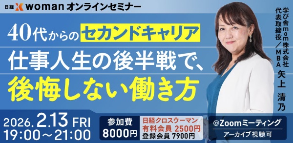 日経クロスウーマンの「40代からのセカンドキャリア 仕事人生の後半戦で、後悔しない働き方」をテーマとしてオンラインセミナーに登壇いたします。自分らしいキャリアを再設計する方法をたっぷり2時間お伝えします。