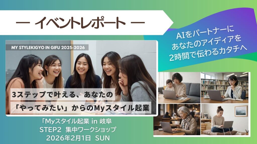 2026年2月1日(日)「Myスタイル起業 in 岐阜 2025–2026」のSTEP2が岐阜市内で開催されました。現在インターン生として学び舎mom様で業務を体験させていただいている中、オンラインにてイベントに参加させていただきました。